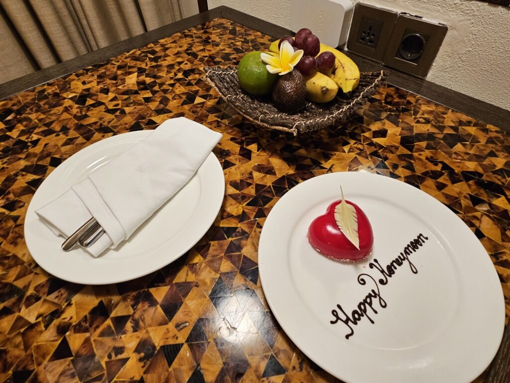 해피 허니문이 새겨진 작은 케잌이 준비되어 있어요