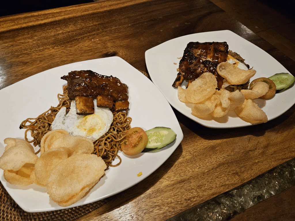 저희가 선택한 메뉴에는 양념 면요리, 립 몇 조각, 새우칩, 방울토마토, 오이 슬라이스가 나왔는데